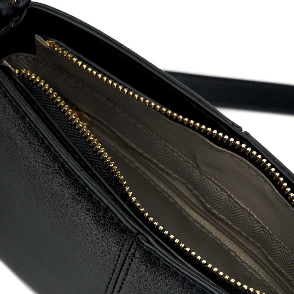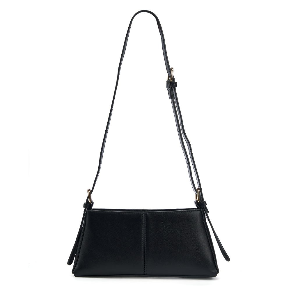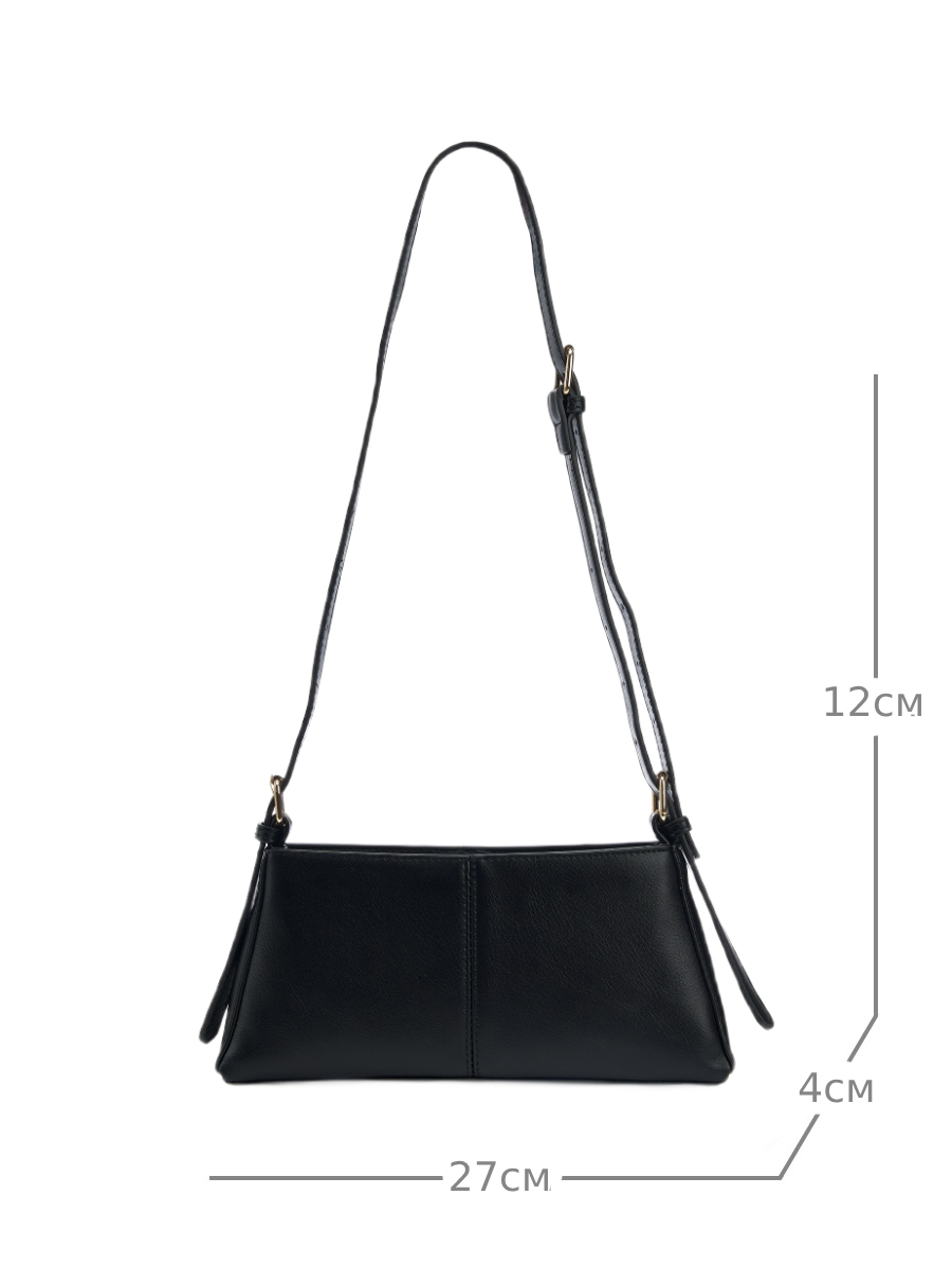 Женская маленькая сумка багет выполнена из искусственной кожи с приятной текстурой. Габариты сумочки - (ВхШхГ) 12х27х4 см. Основное отделение на подкладе из плотного полиэстера закрывается на надежную молнию. Внутри один кармашек на молнии. В комплекте съемный плечевой ремень, регулируется до 115 см. позволит носить сумку на плечо и через плечо как кроссбоди. Фурнитура выполнена из металла в золотистом цвете. Сумка с ручкой поставляется в текстильной (пыльник) и полиэтиленовой упаковке, что защищает ее от повреждений, а также позволяет удобно хранить женскую сумочку в дальнейшем использовании.