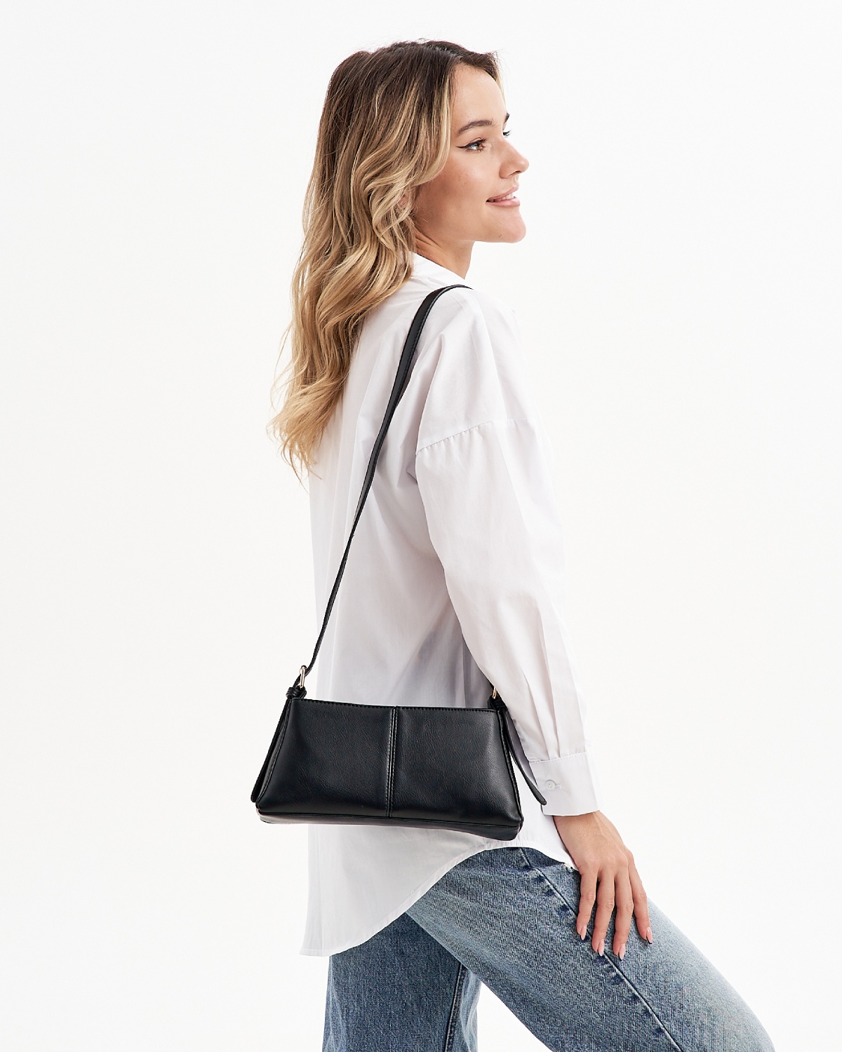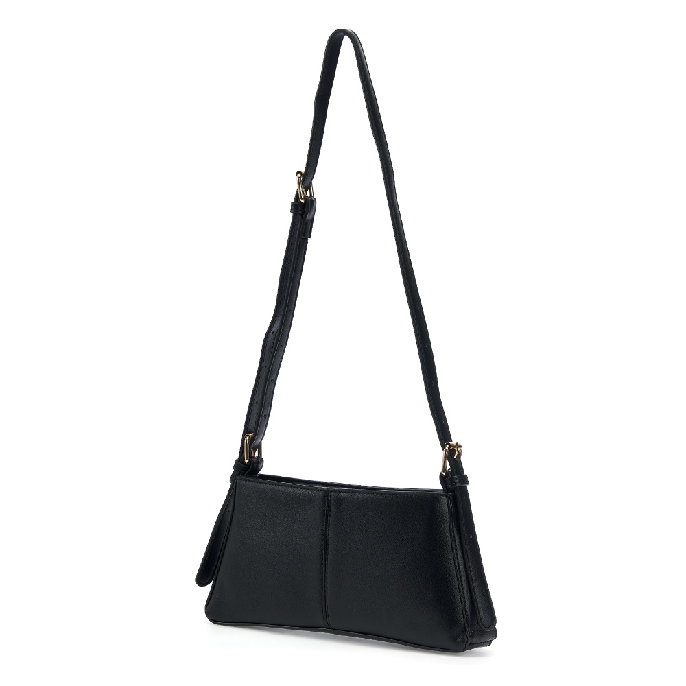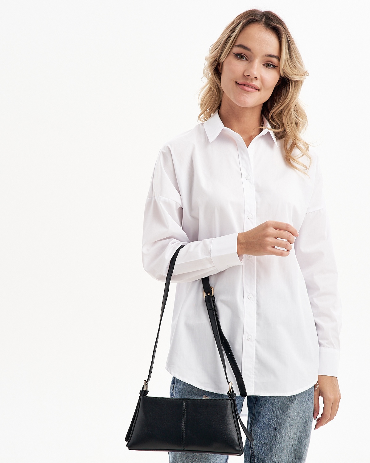 Женская маленькая сумка багет выполнена из искусственной кожи с приятной текстурой. Габариты сумочки - (ВхШхГ) 12х27х4 см. Основное отделение на подкладе из плотного полиэстера закрывается на надежную молнию. Внутри один кармашек на молнии. В комплекте съемный плечевой ремень, регулируется до 115 см. позволит носить сумку на плечо и через плечо как кроссбоди. Фурнитура выполнена из металла в золотистом цвете. Сумка с ручкой поставляется в текстильной (пыльник) и полиэтиленовой упаковке, что защищает ее от повреждений, а также позволяет удобно хранить женскую сумочку в дальнейшем использовании.
