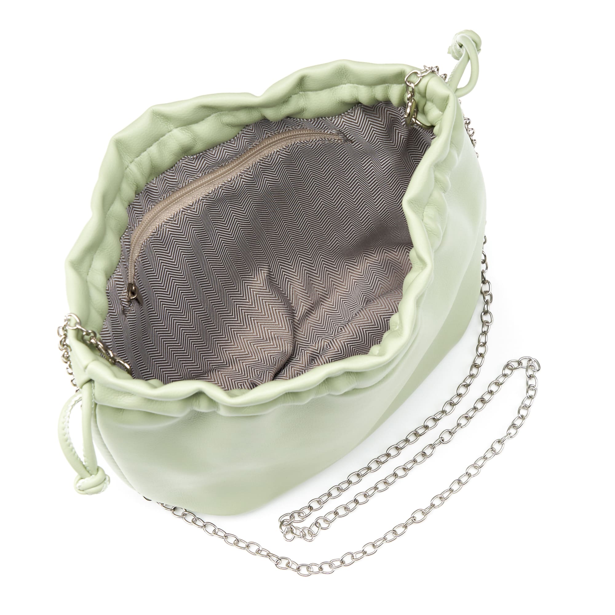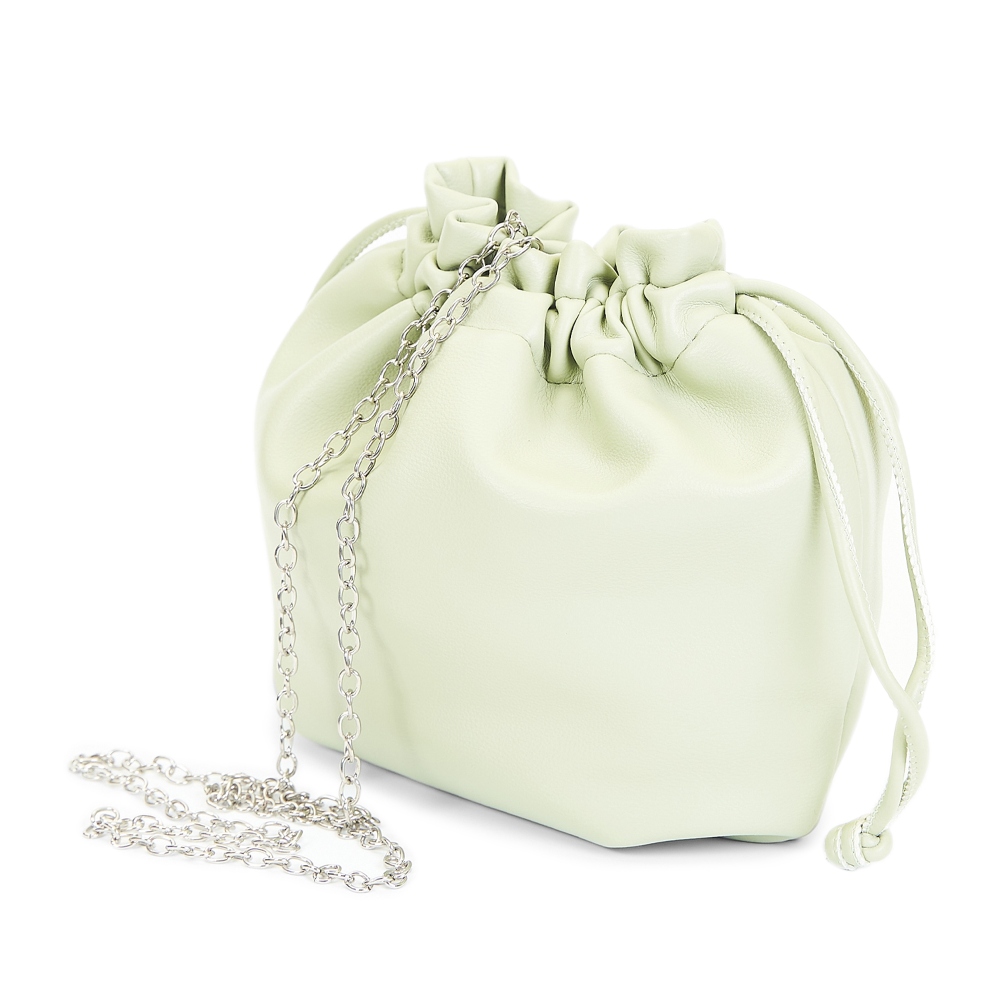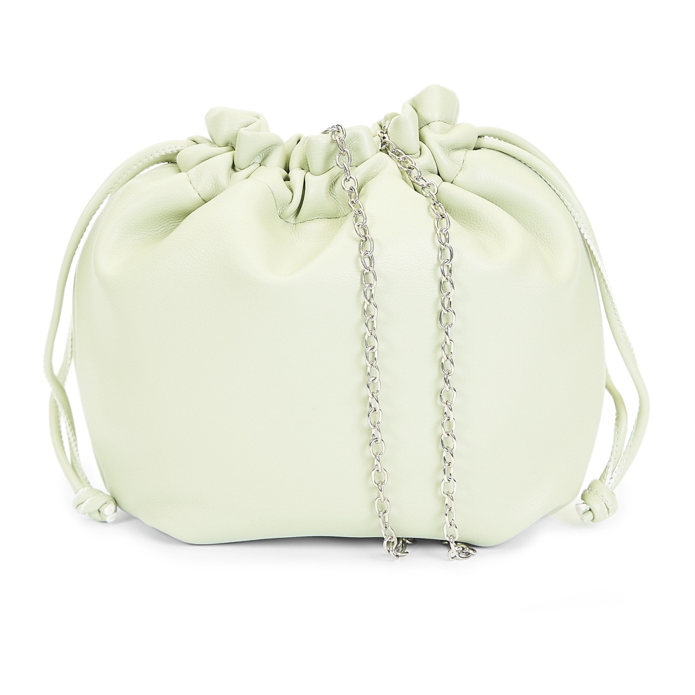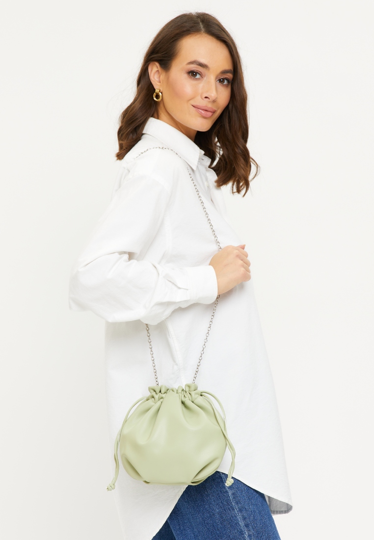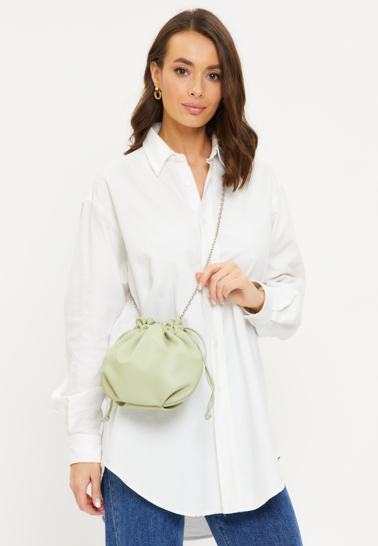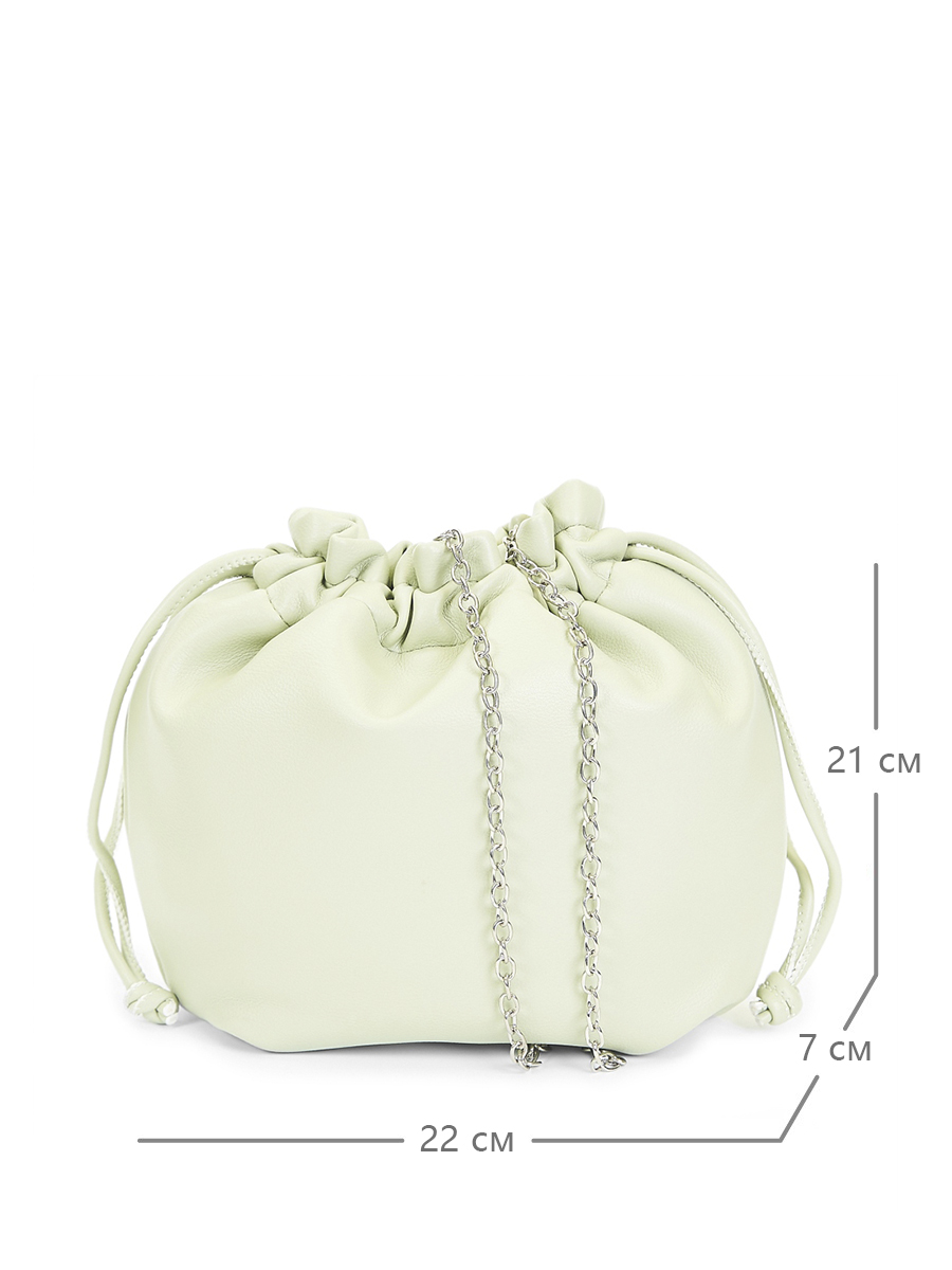 Женская мягкая сумка-кисет из искусственной кожи с подкладом на длинной цепочке - 125 см. Основное отделение затягивается шнурком. Сумка поставляется в текстильной и полиэтиленовой упаковке.