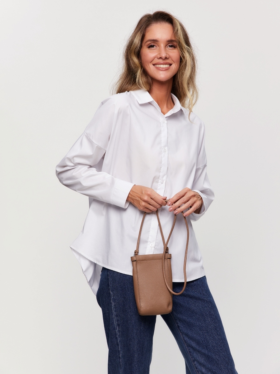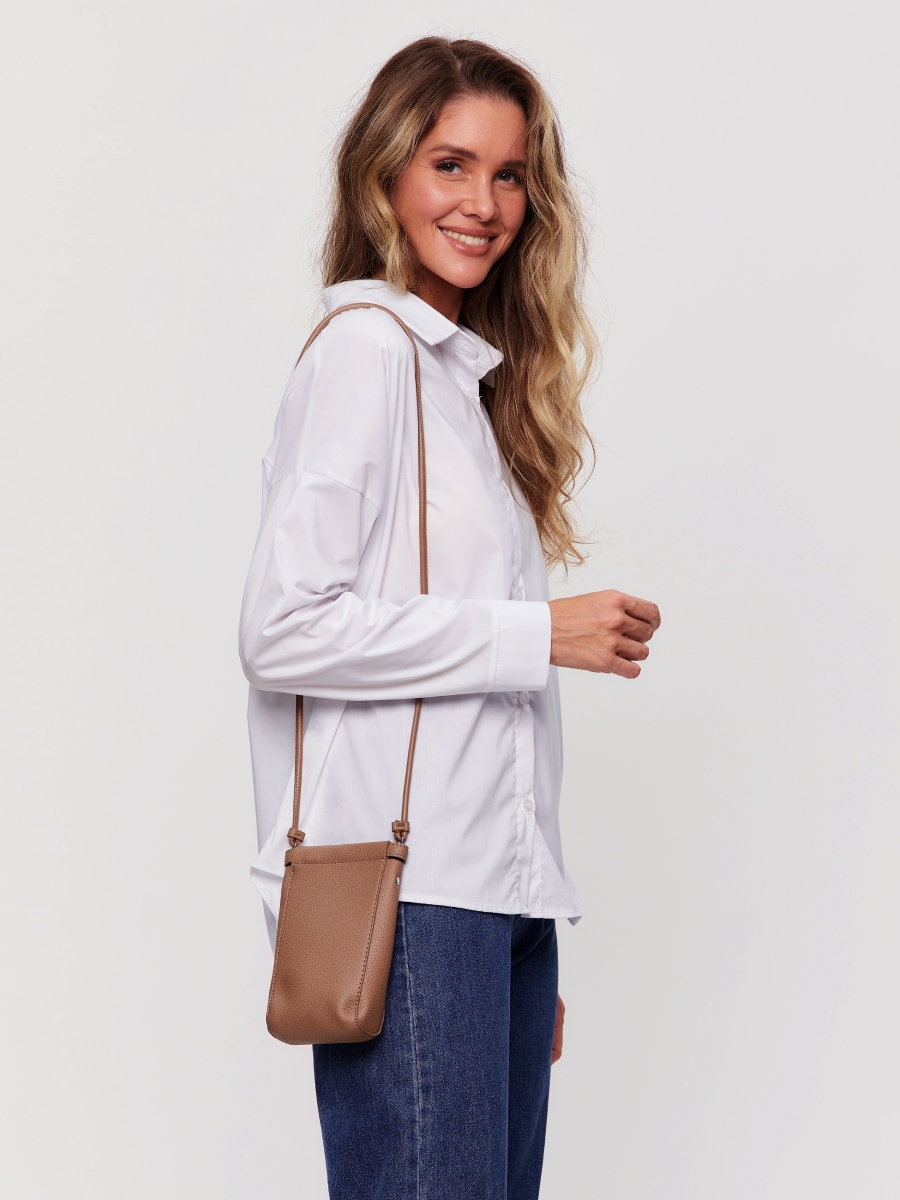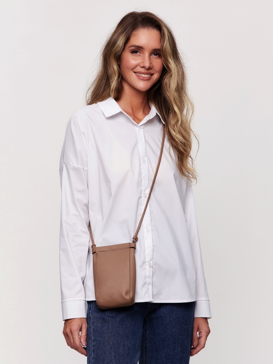 Миниатюрная женская сумка из зернистой искусственной кожи на длинном шнурке. Основное отделение закрывается на магнит. Сумка поставляется в текстильной и полиэтиленовой упаковке.