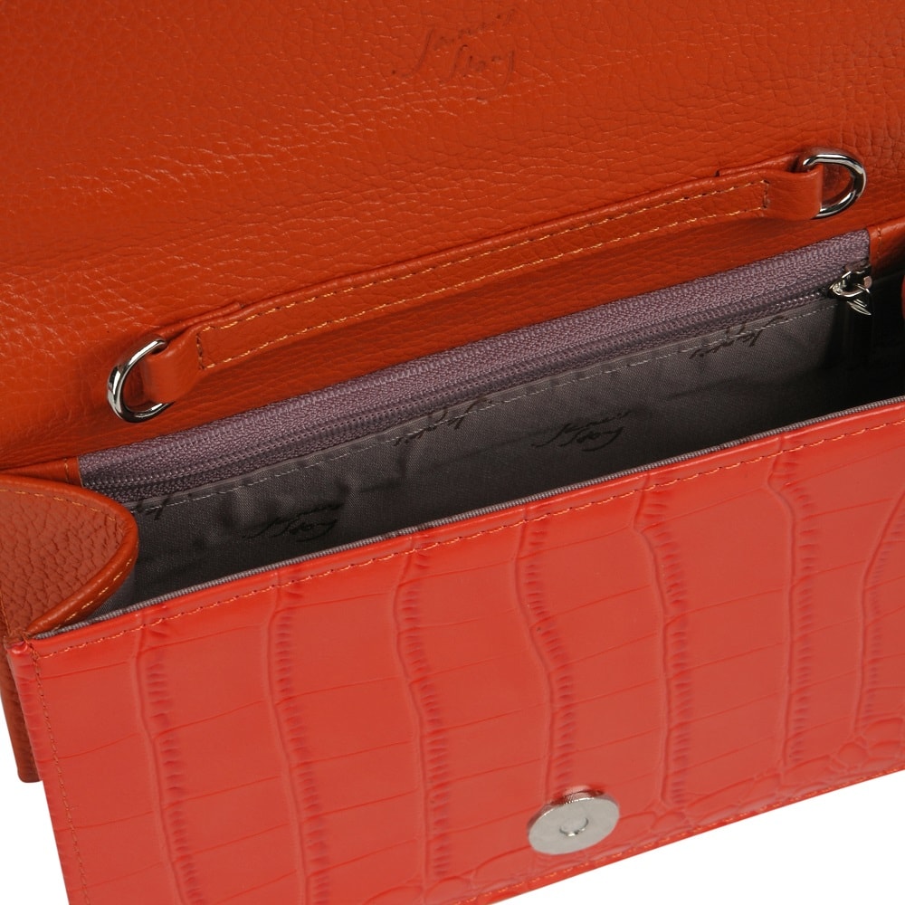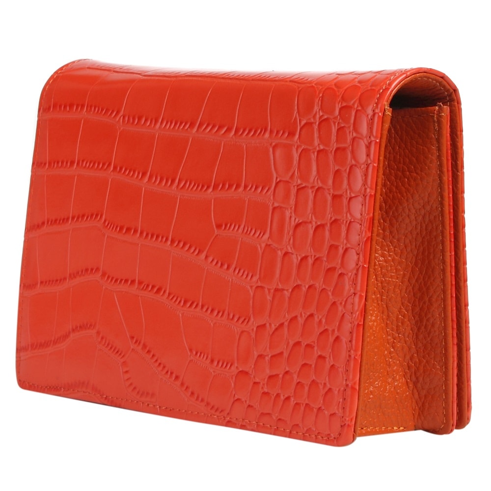 Небольшая формованная модель, изготовлена с использованием двух видов кожи : снаружи - глянцевая с тиснением под рептилию , внутри - зернистая. Отлично сочетается с фурнитурой золотистого цвета. Под клапаном на кнопке - магните находится одно основное открытое отделение, внутри которого выделены секции для карточек и есть карман - перегородка на молнии. Цепочка через плечо металлическая на изящных карабинах, максимальная высота до верхнего края сумки 57 см.