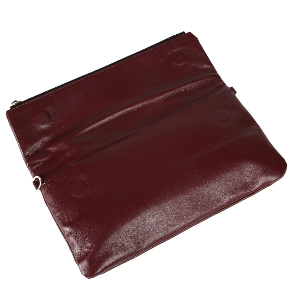 Интересная небольшая модель из натуральной гладкой кожи, отлично сочетающейся с фурнитурой серебристого цвета. Закрывается на молнию и загиб на лицевую часть - на два магнита. Выделены карманы: внутри - один открытый и один потайной. В комплекте два ремня: на руку и длинный плечевой.