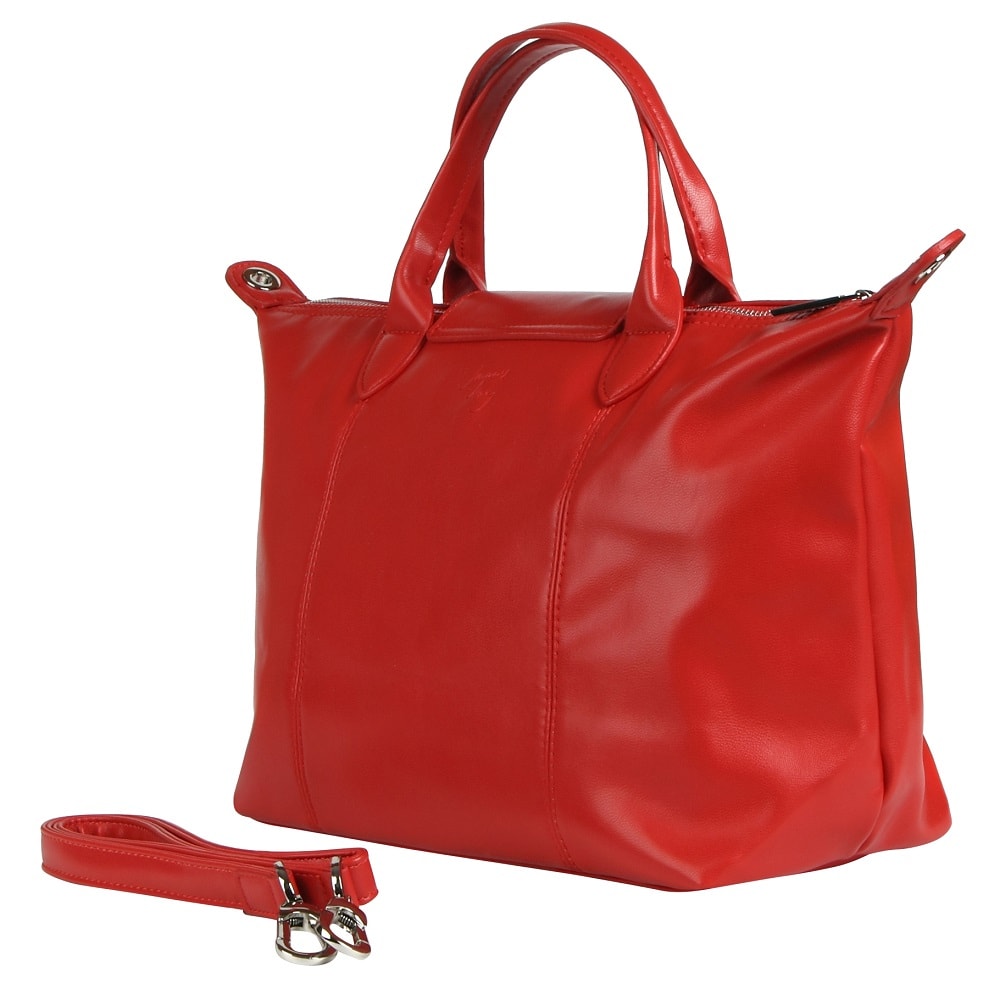 Большая удобная модель, изготовлена из искусственной кожи, прекрасно сочетающейся с фурнитурой серебристого цвета. Одно основное отделение под клапаном на молни, внутри которого выделены карманы: два открытых и один потайной. Длинный плечевой ремень прилагается.