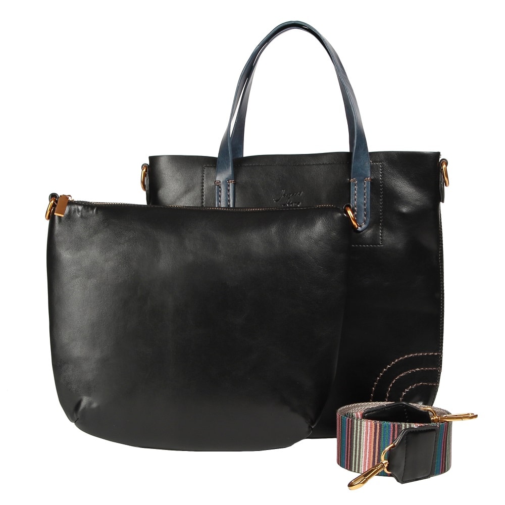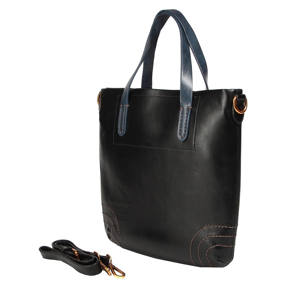 Большая удобная сумка-шоппер из гладкой эко кожи двух цветов, отлично сочетающейся с фурнитурой золотистого цвета. Продается в комплекте с небольшой сумочкой из того же цвета и материала. Конструкция большой модели: одно основное отделение на молнии; маленькой - одно основное отделение на молнии с двумя открытыми и одним потайным карманом. Длинный плечевой ремень из текстиля прилагается - максимальная высота до края изделий - 45 см.