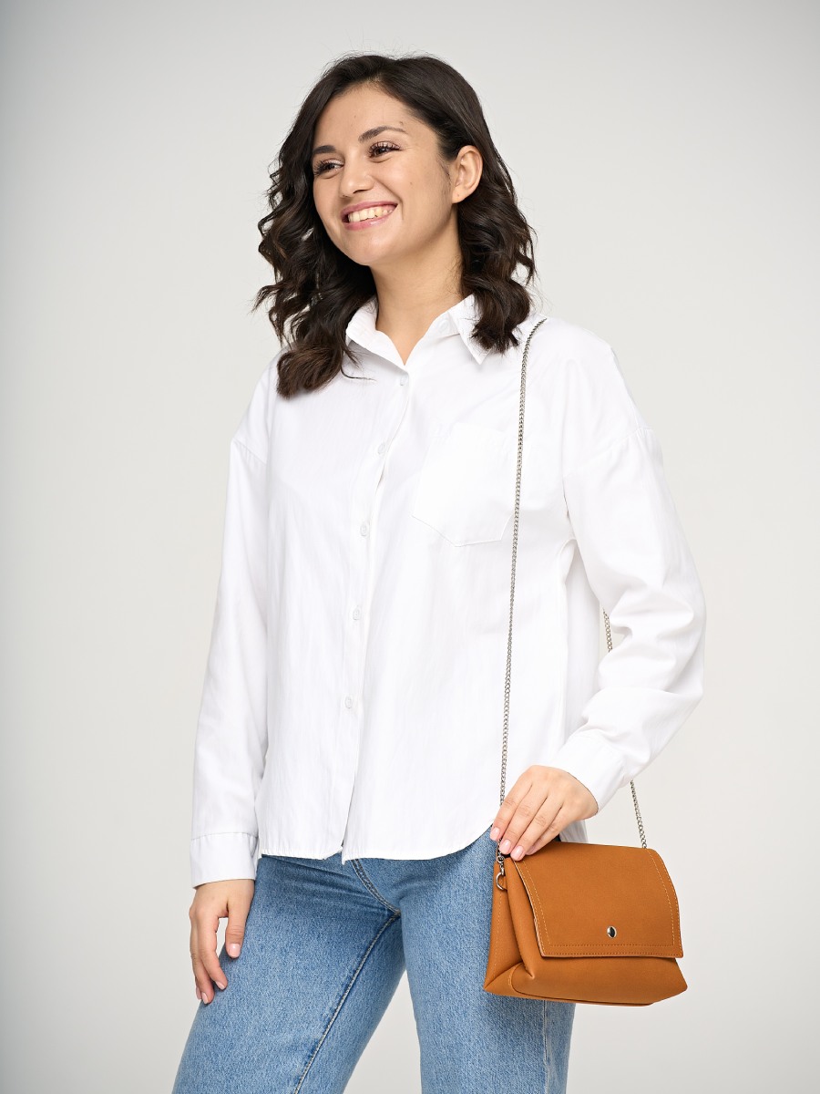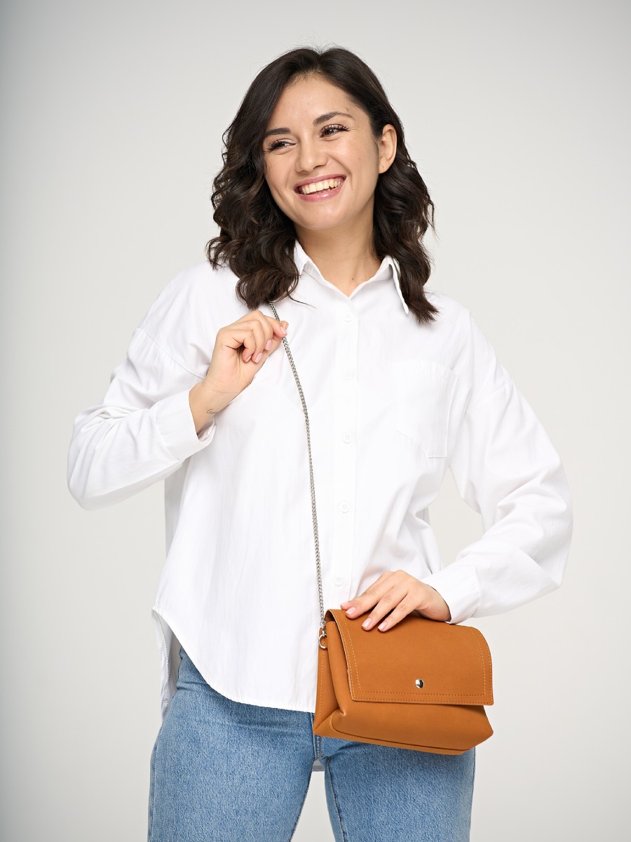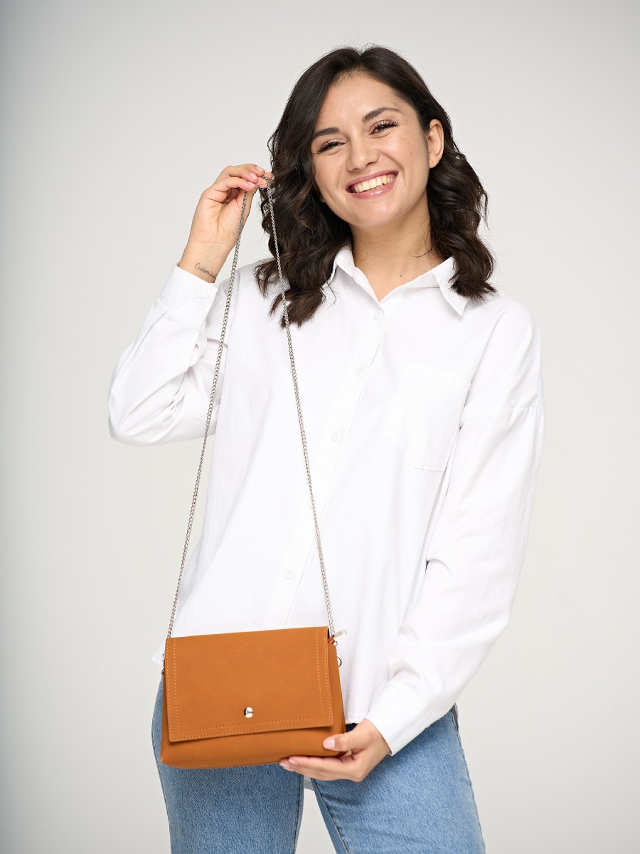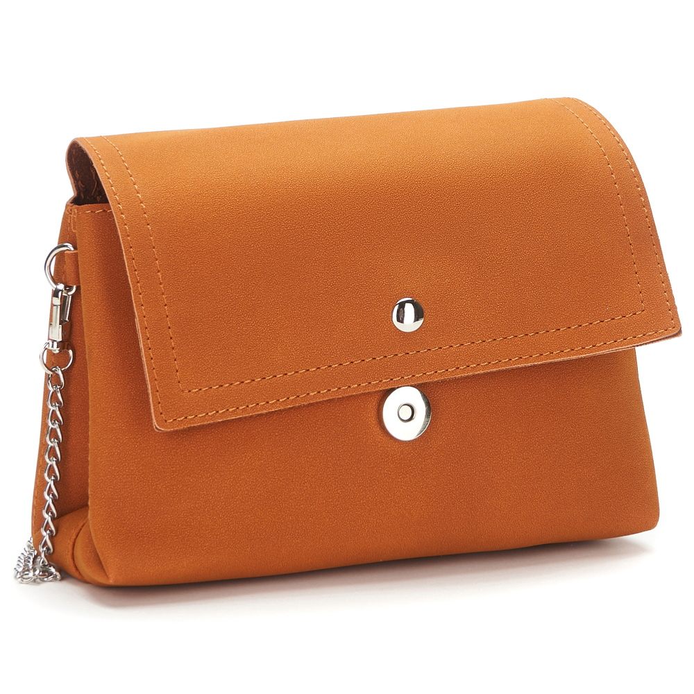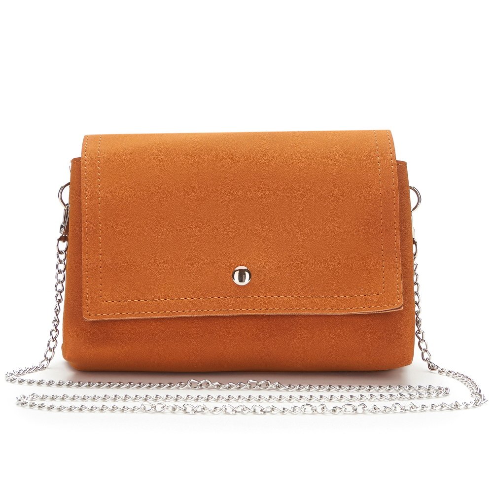 Элегантная модель небольшого размера. Под клапаном на магните расположено основное отделение-на молнии. В комплекте длинный плечевой ремень - цепь.