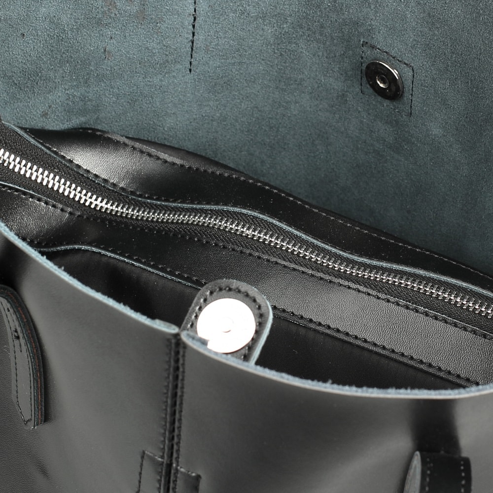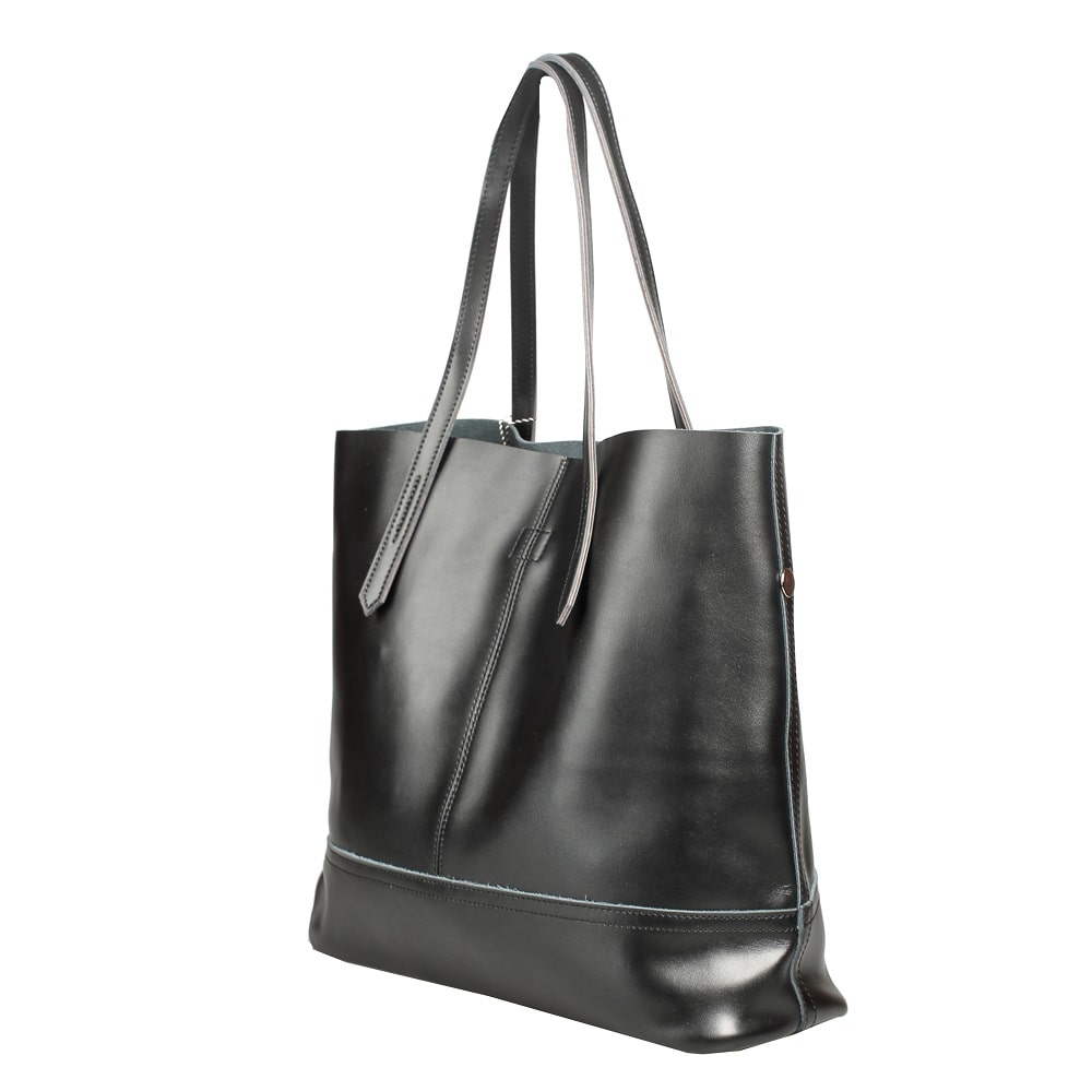 Большая и вместительная сумка-шоппер из натуральной кожи, прекрасно сочетающейся с фурнитурой серебристого цвета. Внутрь основного открытого отделения без подклада на магните вставляется текстильный мешочек на молнии, внутри которого выделены карманы: два открытых и один на молнии.