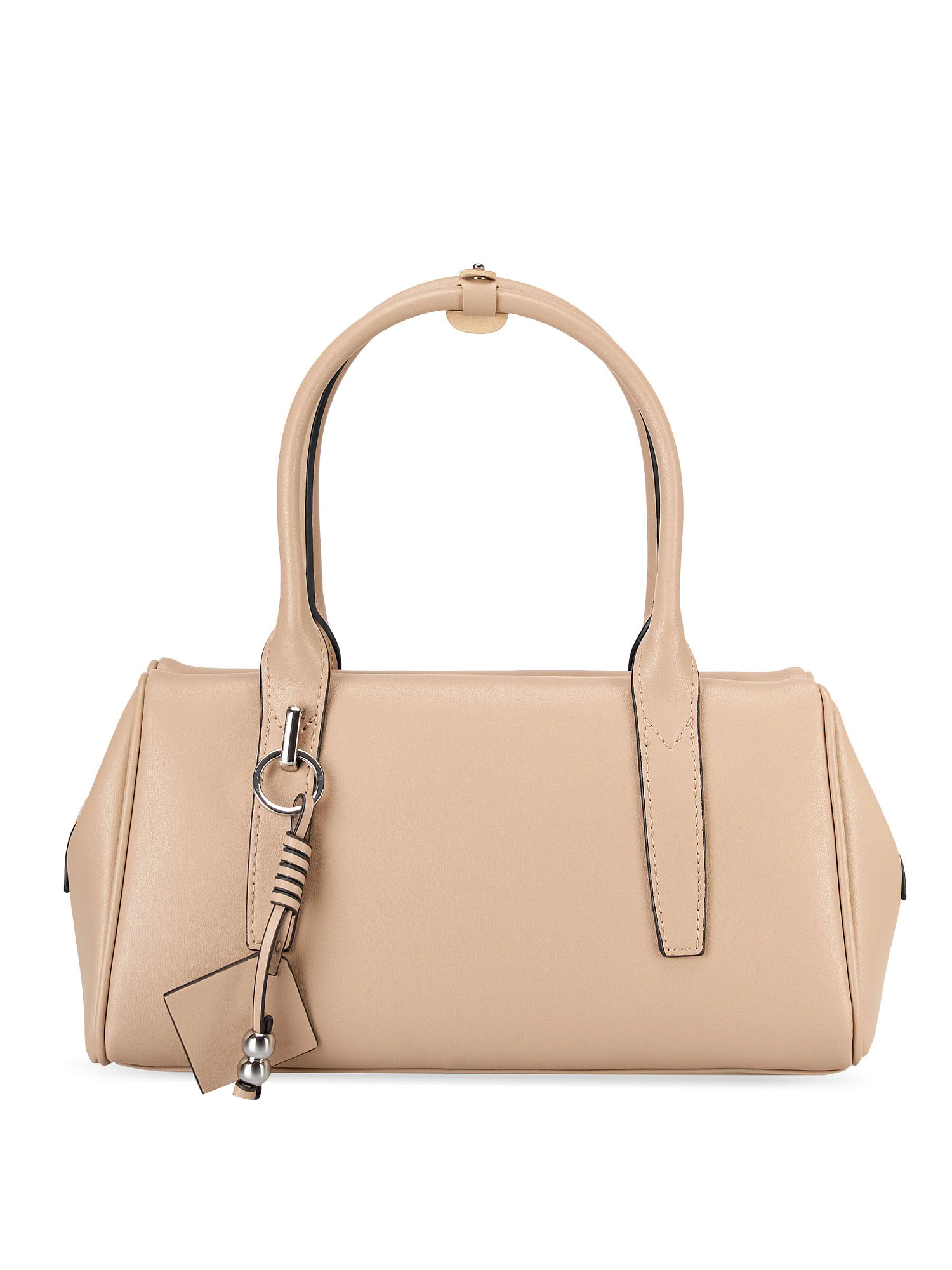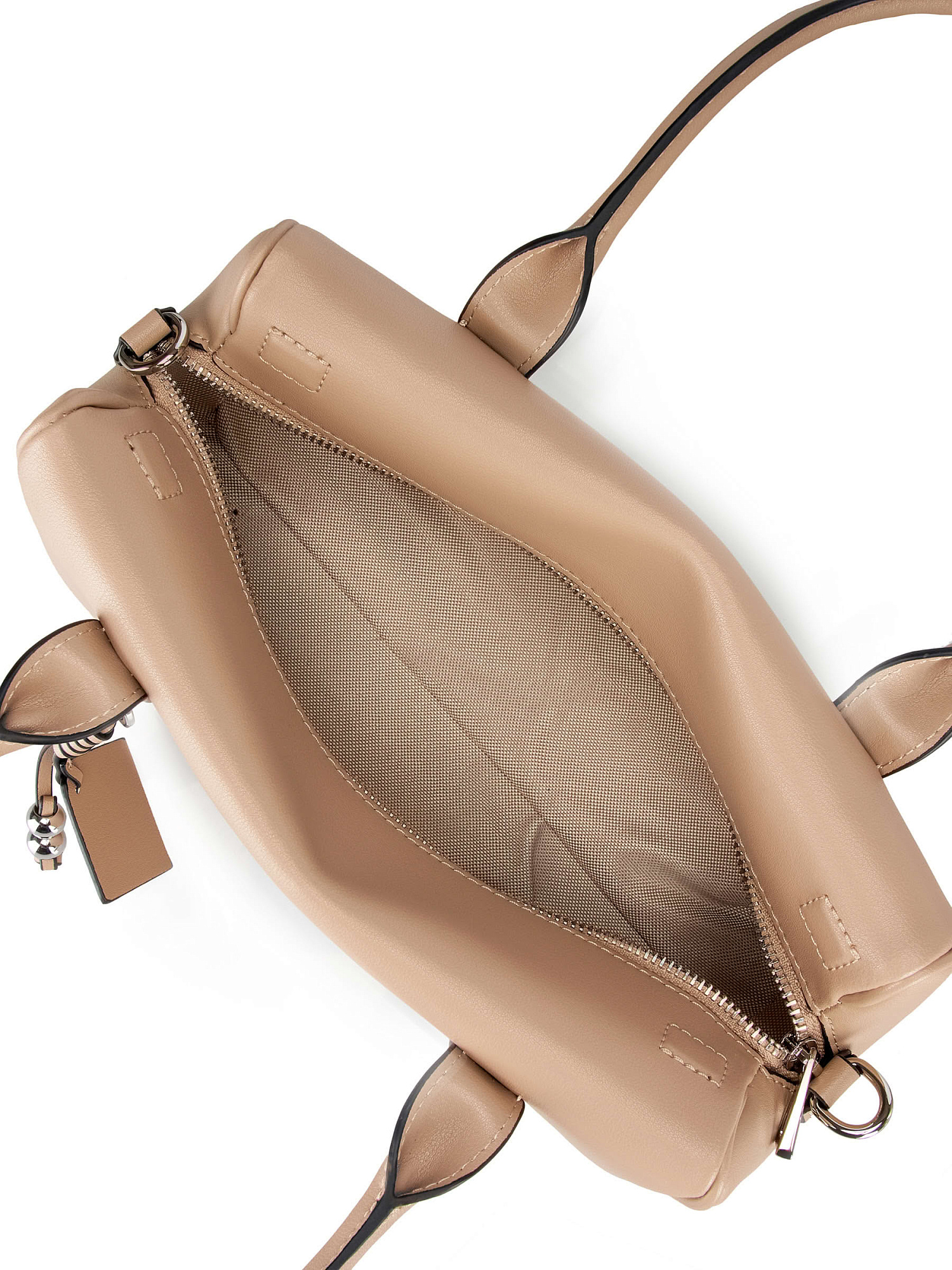 Небольшая сумка с двумя ручками из натуральной гладкой кожи. Сумочка имеет габариты 27*15*11. Основное отделение закрывается на молнию, внутри два кармана, один открытый, другой потайной. Подклад сумки из плотного полиэстера. В комплекте есть плечевой ремень, который регулируется по длине от 94 до 113 см. Фурнитура сумки выполнена в металле под серебро.