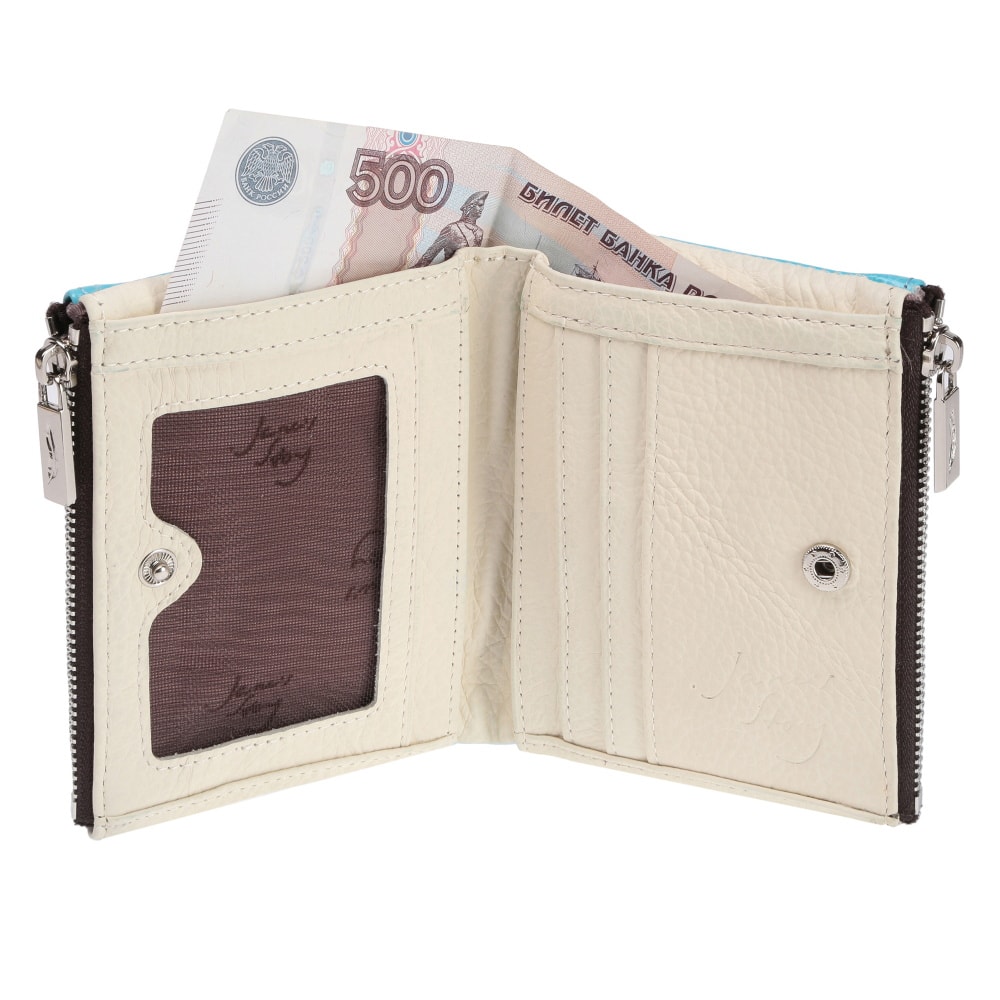 Небольшой женский кошелек из натуральной кожи с принтом, отлично сочетающейся с фурнитурой серебристого цвета. Внутреннее наполнение: одно основное отделение, три на молнии и шесть - под карты. Купюры располагаются в сложении пополам. Упакован в красивую картонную коробочку, прекрасный подарочный вариант.