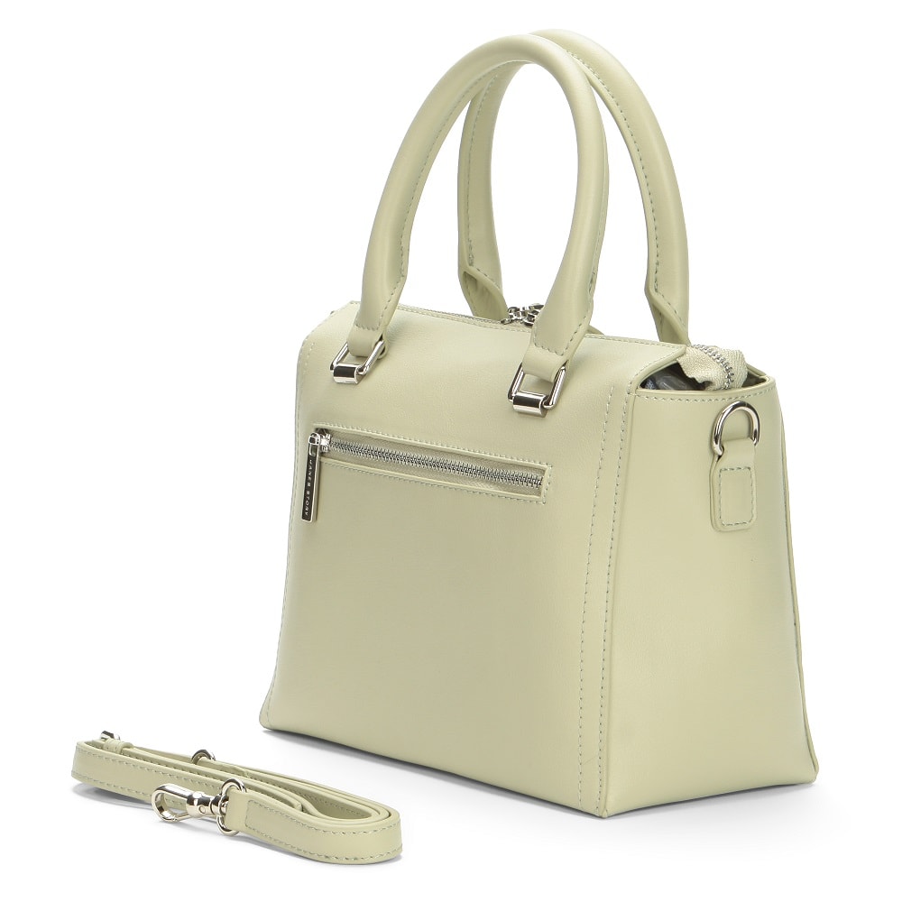 Средняя по размеру удобная модель, изготовленная из натуральной гладкой кожи, отлично сочетающейся с фурнитурой серебристого цвета. Одно основное отделение на молнии, внутри которого выделены карманы: перегородка, один потайной и один открытый. С обратной стороны расположена дополнительная секция. В комплекте идёт длинный плечевой ремень.