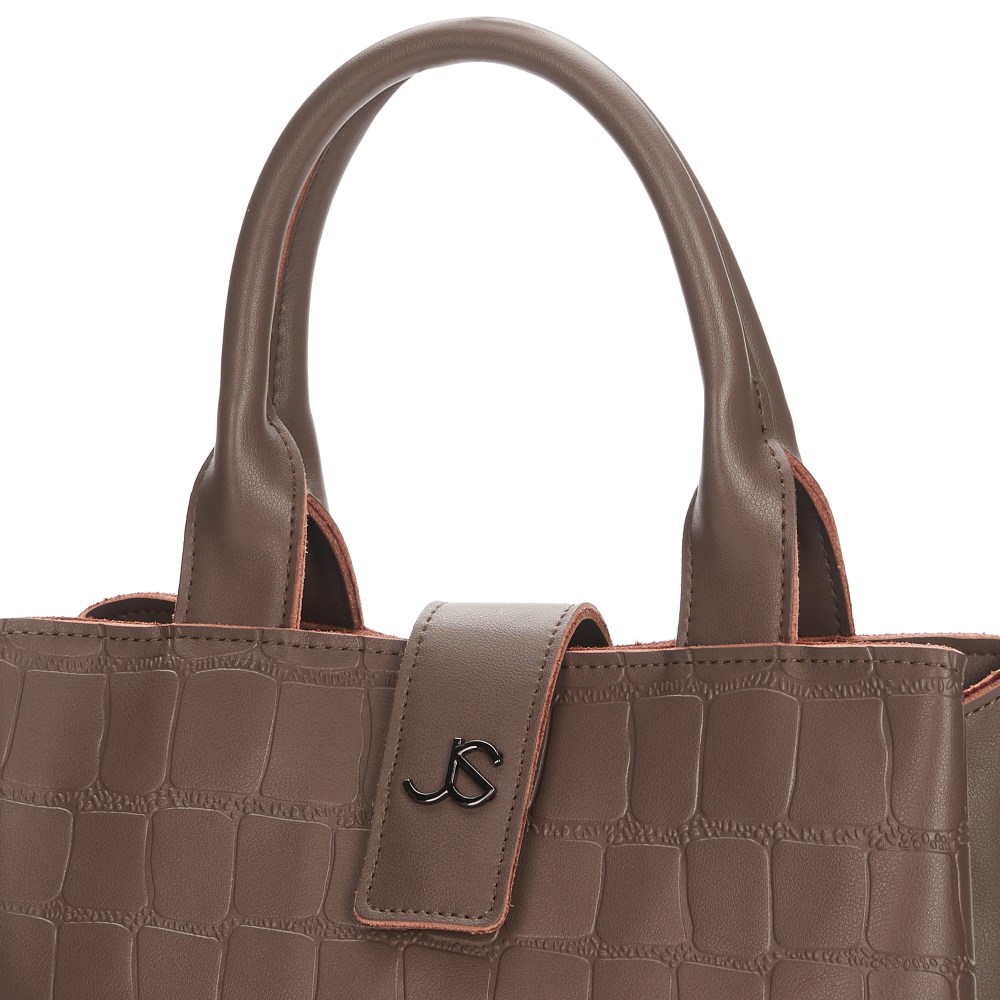 Интересная форма модели придает ей особый шарм. Изготовлена из натуральной гладкой кожи с тиснением под рептилию, прекрасно сочетается с затемненной фурнитурой цвета никель. Одно основное отделение на молнии, внутри которого выделены карманы: два открытых, один потайной и карман-перегородка. На обратной стороне - дополнительная секция на молнии. Длинный плечевой ремень прилагается.