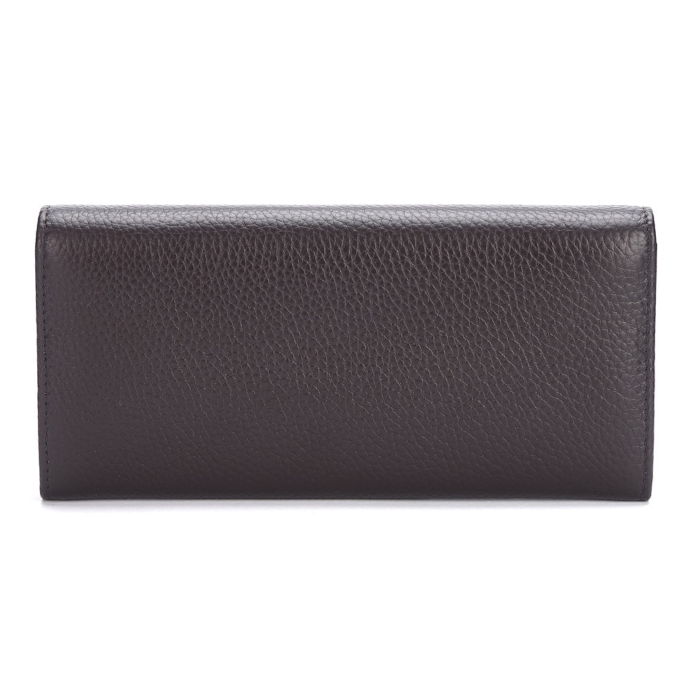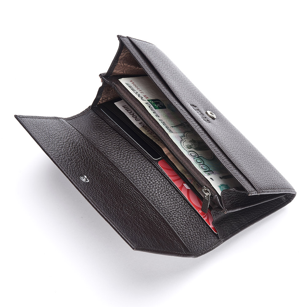Классический женский кошелек на кнопке из натуральной зернистой кожи, отлично сочетающейся с фурнитурой серебристого цвета. Под клапаном на кнопке выделены отделения: два открытых, одно потайное, одно на молнии во всю ширину (для мелочи), несколько секций под карты. Купюры расположены без сложения. Продается в фирменной подарочной коробке.