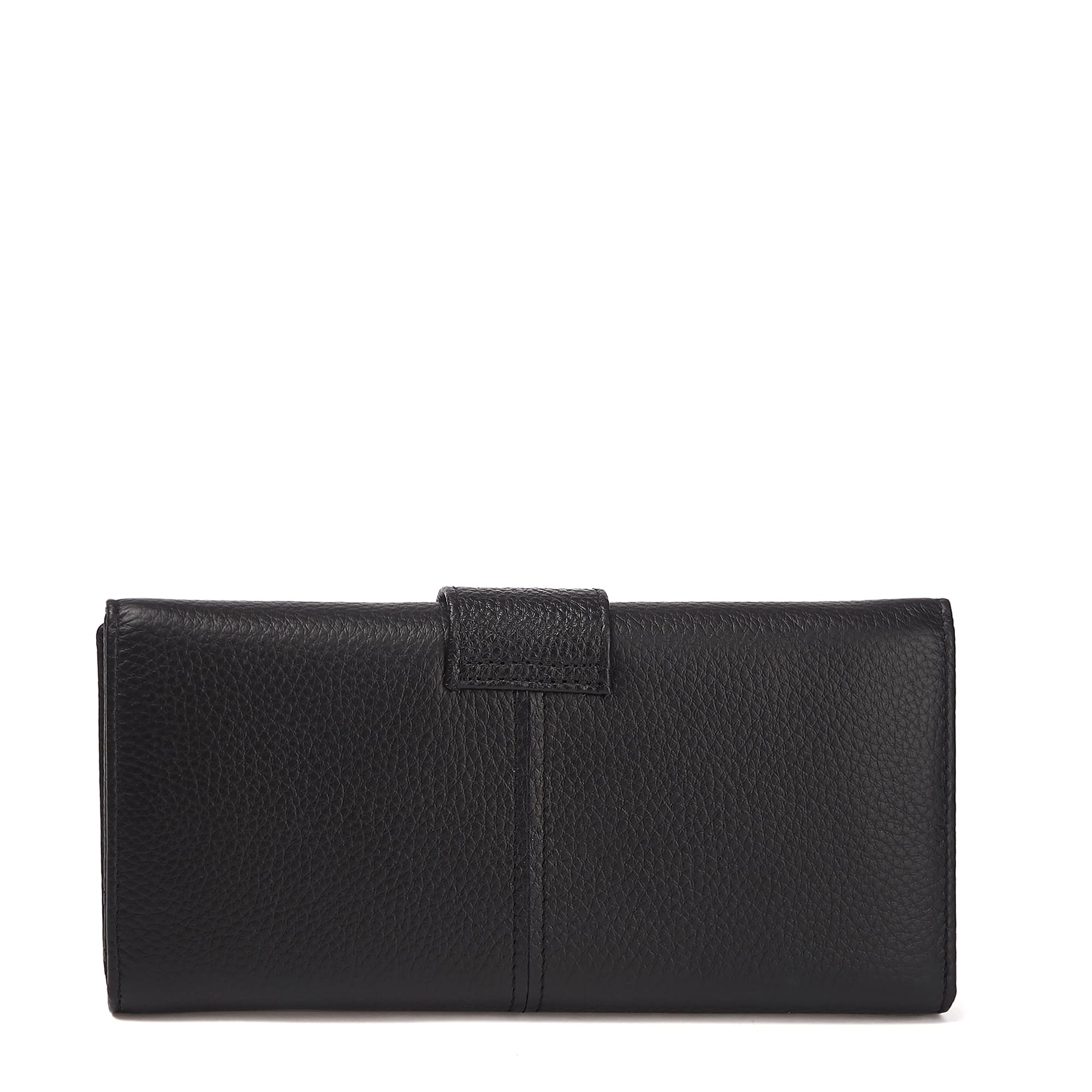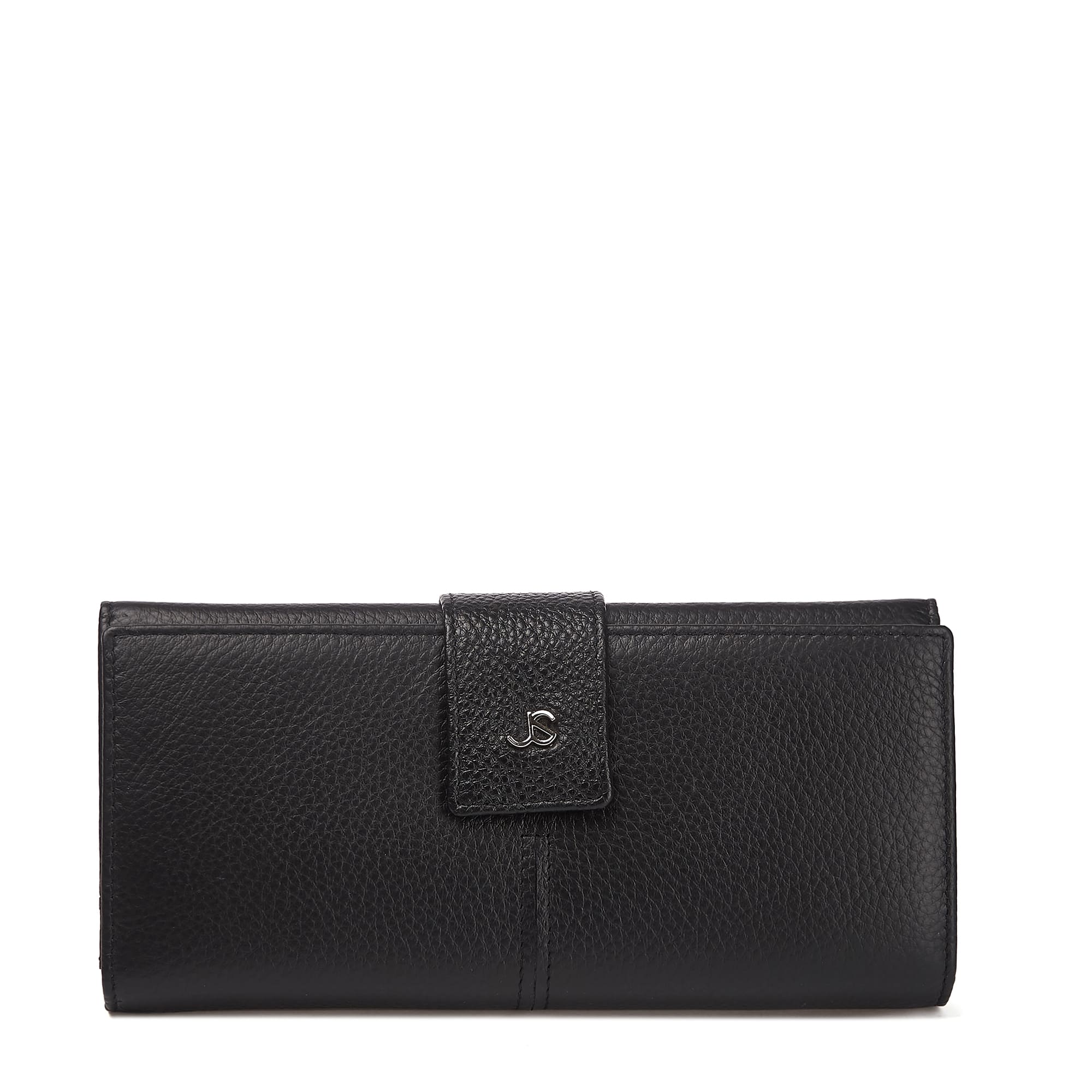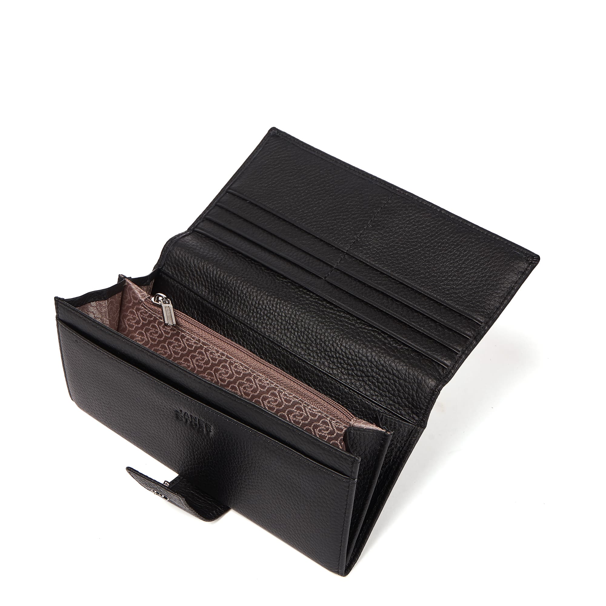 Солидный кошелек из натуральной зернистой кожи, прекрасно сочетающейся с фурнитурой серебристого цвета. Три основных отделения под клапаном на кнопке: посередине - на молнии для монет, два других - открытые для купюр, три потайных открытых и шесть секций под карты. Продается в фирменной подарочной коробке.