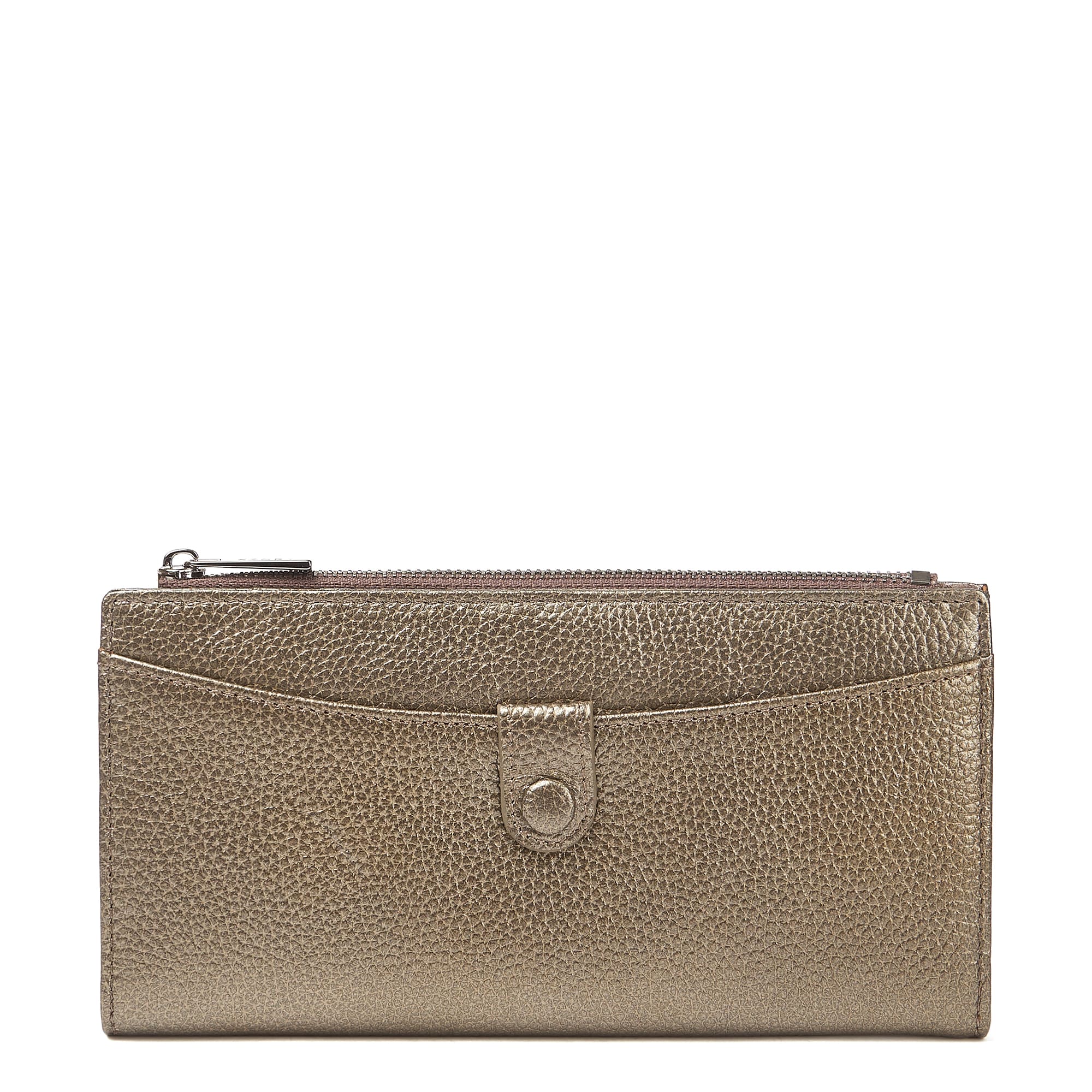 Вместительный кошелек из натуральной зернистой кожи. Основное отделение на кнопке под клапаном, внутри которого одно открытое отделение для денежных купюр и 12 секций под карты. Также выделен карман для монет - на молнии во всю длину модели. Продается в фирменной подарочной коробке.