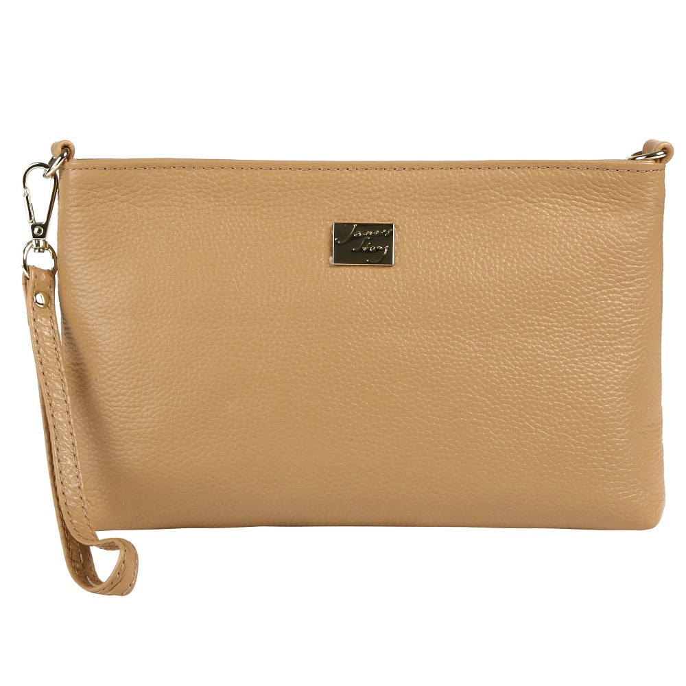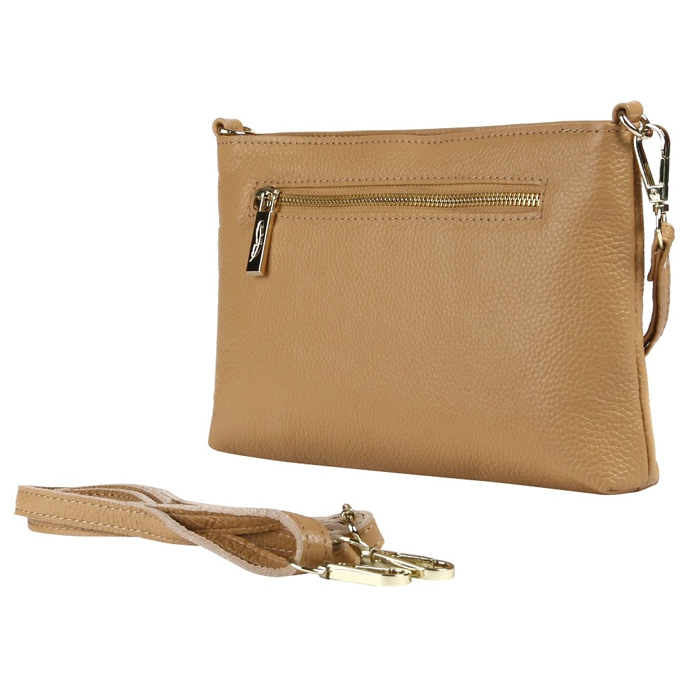 Компактная и легкая модель, изготовленная из натуральной зернистой кожи, отлично сочетающейся с фурнитурой золотистого цвета. Одно основное и дополнительное отделение (на обратной стороне) - на молнии. Выделены карманы: два открытых и один потайной. В комплекте два ремня: длинный плечевой и на запястье.