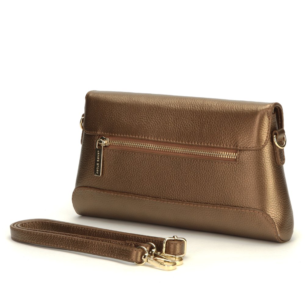 Стильная небольшая модель, изготовленная из натуральной зернистой кожи, отлично сочетающейся с фурнитурой золотистого цвета. Под клапаном на магнитах расположено одно основное отделение на молнии, внутри которого выделены карманы: перегородка, потайной и открытый. В комплекте длинный плечевой и ремень на запястье.
