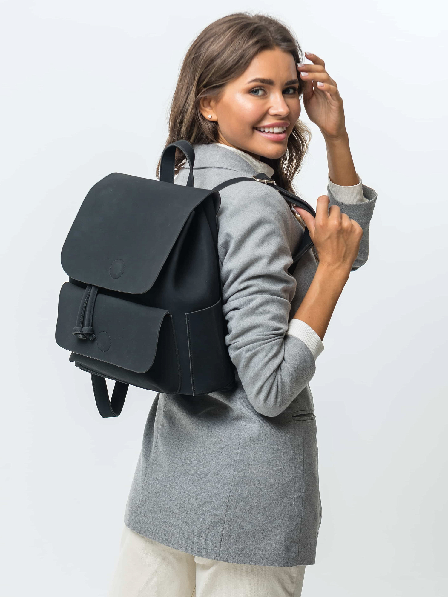 Невероятно модный рюкзак из искусственной замши, прекрасно сочетающейся с фурнитурой серебристого цвета. Под клапаном на кнопке-магните расположено одно основное утягивающееся шнурком отделение. На лицевой стороне - накладной карман, закрывающийся клапаном на кнопку-магнит. Боковины обрамлены открытыми накладными карманами. Лямки рюкзака регулируются по размеру.