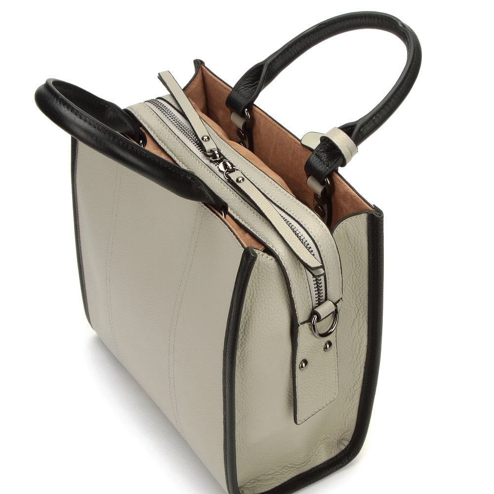 Элегантная модель из натуральной зернистой кожи, прекрасно сочетающейся с фурнитурой серебристого цвета. Три основных отделения на молниях, внутри среднего выделены карманы: два открытых, один потайной. Длинный плечевой ремень прилагается.