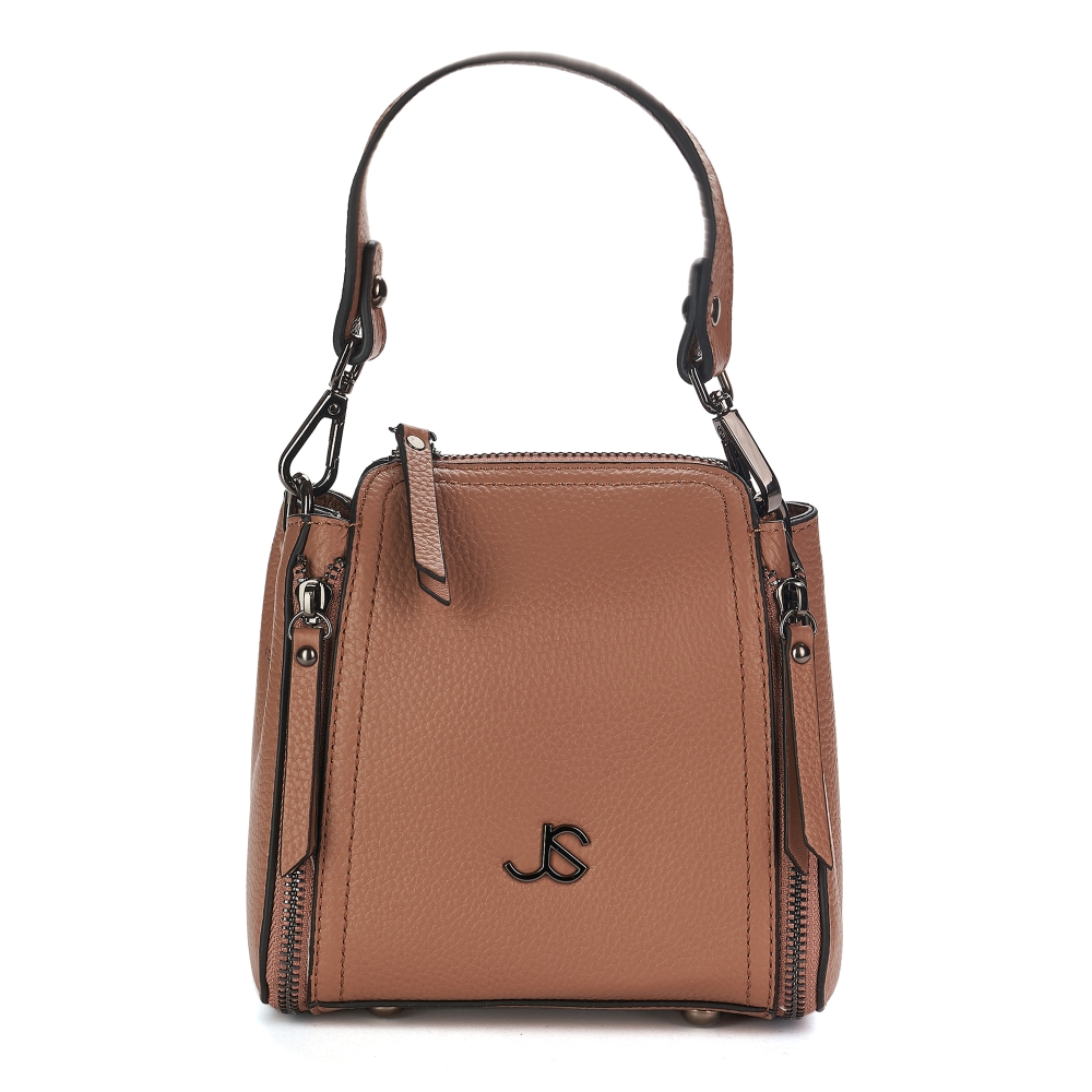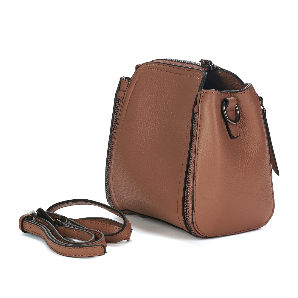 Интересная небольшая модель изготовлена из натуральной зернистой кожи, отлично сочетающейся с затемненной фурнитурой цвета никель. В комплекте два плечевых ремня: короткий и длинный. Одно основное отделение, закрывающееся на молнию. Внутри которого расположены карманы: открытый, потайной и один-перегородка.